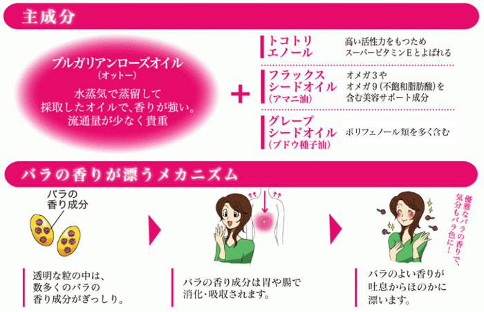 体内から香るローズのゴージャスなオイルサプリメントで、美しく健康に、良い香りのエチケットを始めませんか。おすすめです。